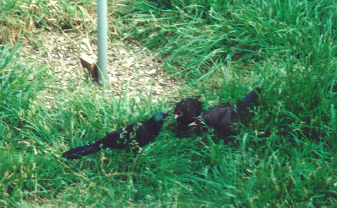 • Common Grackle (Adult & 2 babies feeding) - Mixed seed on ground