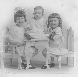Mother had been a big influence in our lives. She had a beautiful soprano voice and also played the piano. We learned the ABC's early in German and also English. She always encouraged us in whatever we wanted to do. Later she started to paint by numbers and then mixed her own paints. Through her we always liked books, music, art, plays. She enjoyed club work. We always attended Sunday School and Church at the Baptist Church, where Mother sang in the choir. The six of us were seated in the front row pew. When I was sixteen the Baptist Church merged with the Brethren Church and later became the Community church.