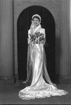 Harold and I were married in my home on June 10, 1938 with Jim and Jean as our attendants. There were about 40 guests. My gown was floor length satin with a long train and a veil. Jim wasn't able to practice when we did so he kept asking me all the way down the stairs what he was supposed to do. Once he stepped on my train.